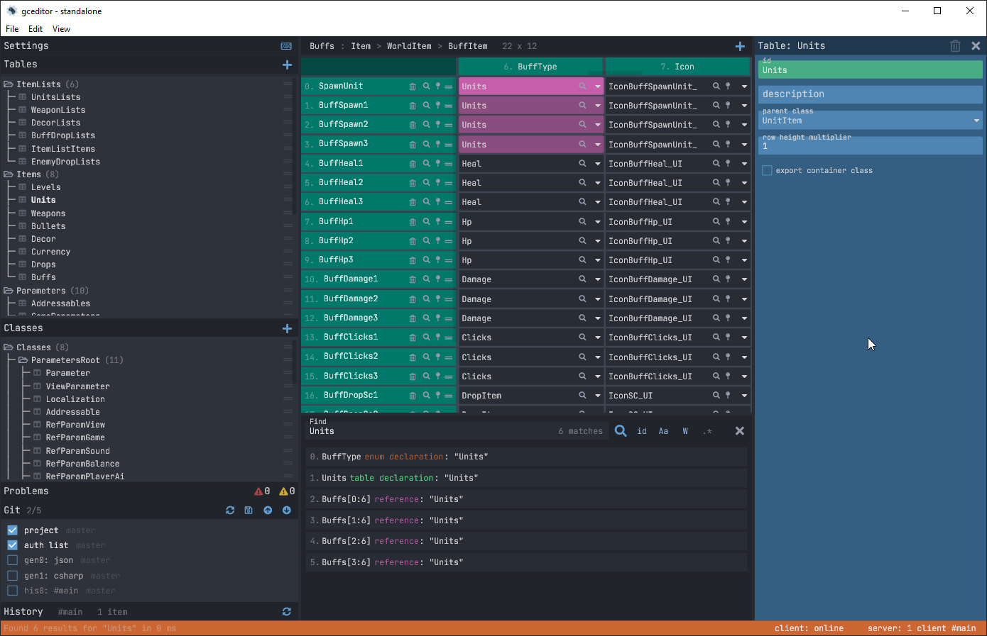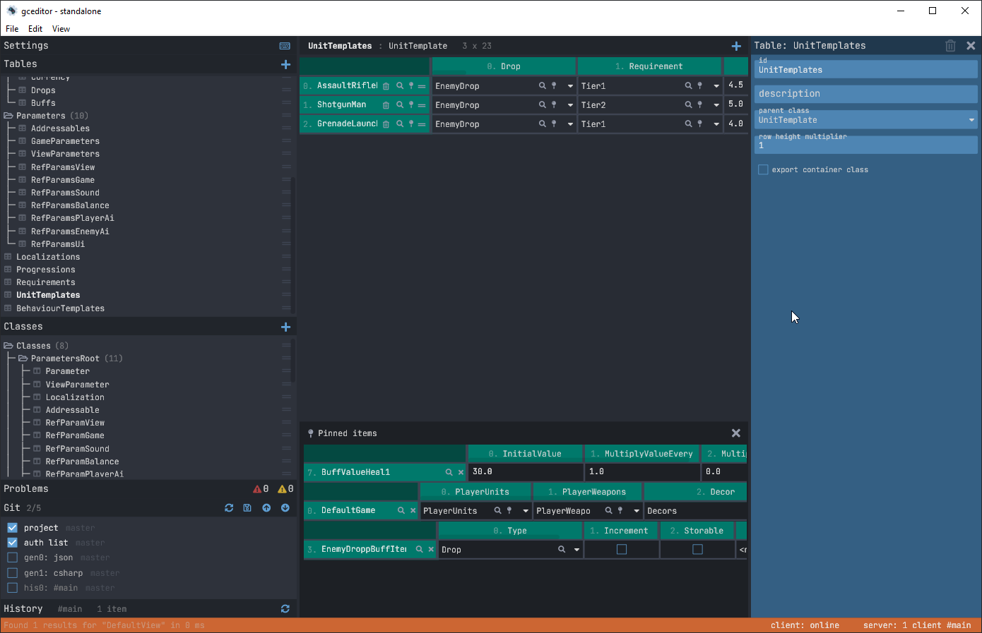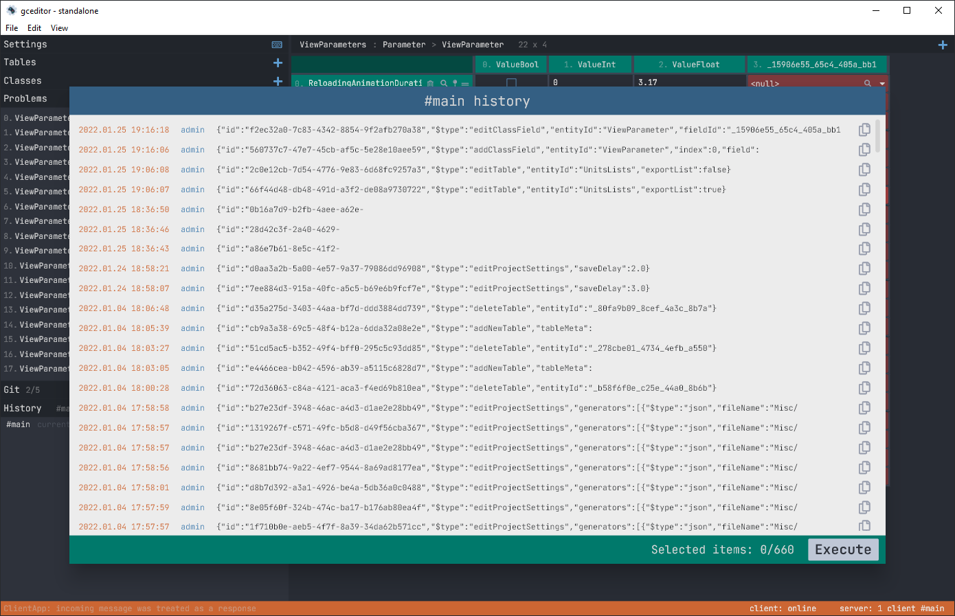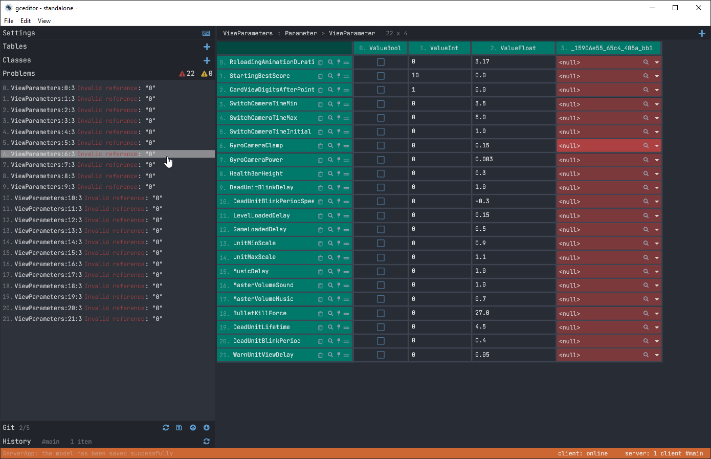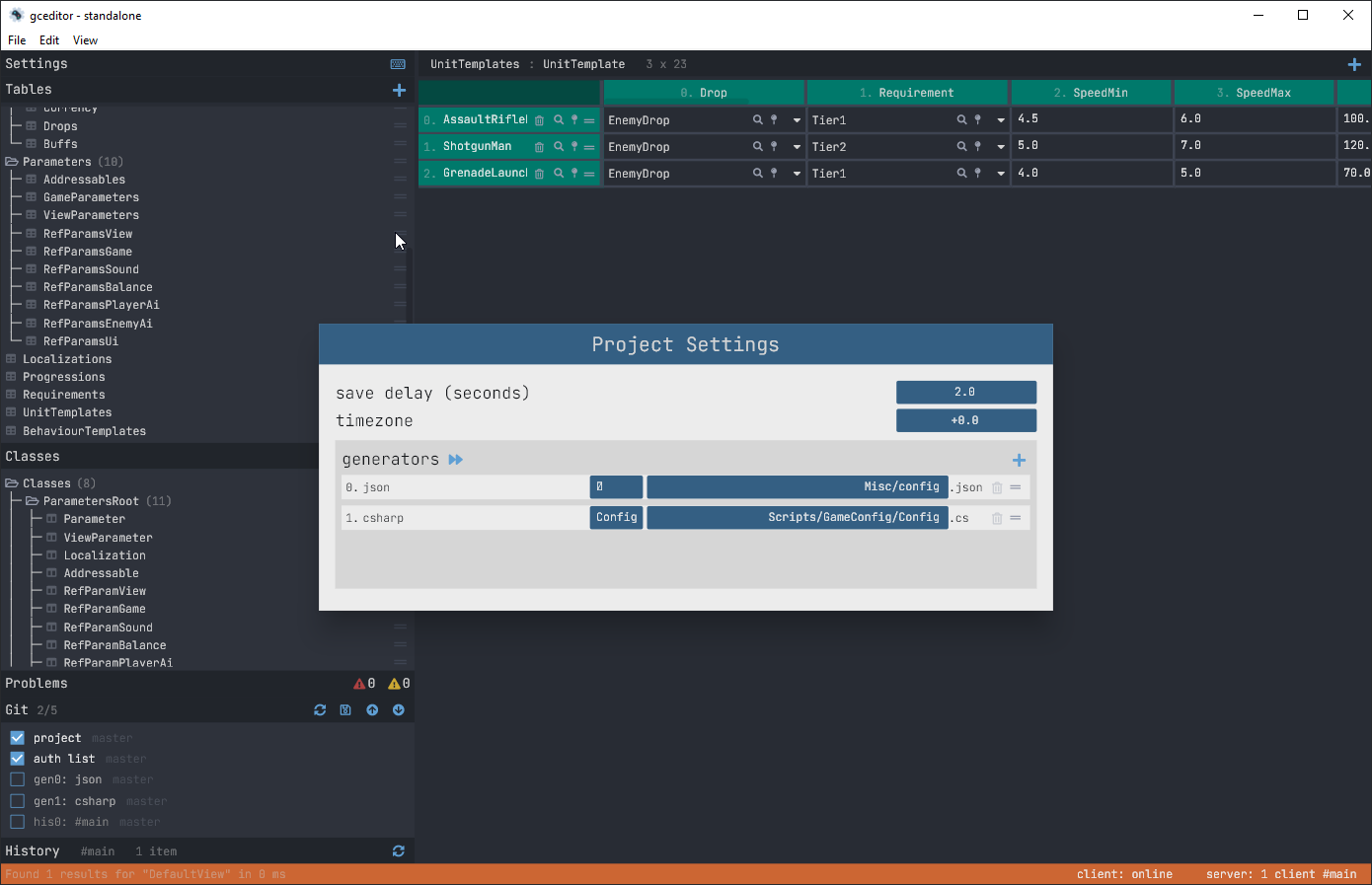 gceditor is a client/server application for creating a persistent data of an application (config/model). It can generate json, c# files for the model which makes it very useful for c#-based applications/games.